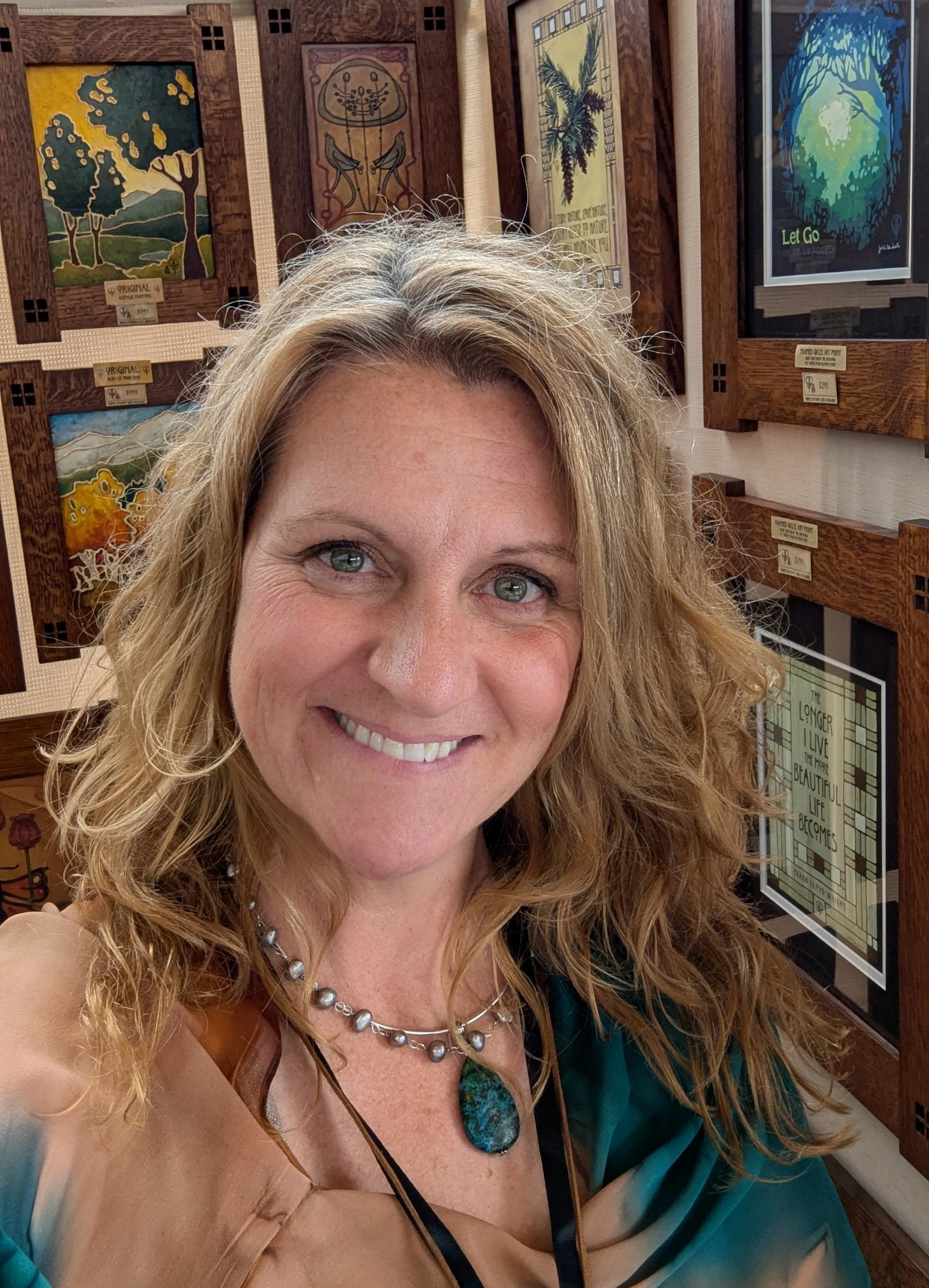 Julie Leidel is a Master Roycroft Renaissance Artisan specializing in creating revivalist artwork, inspired by the Art Nouveau and Arts & Crafts Movements (1880-1920). Working in acrylic, gouache, and enamel, Julie evokes a feeling of yesteryear in her work. She paints because beauty and words heal. They soften what’s hardened, mend what’s been divided, and invite us to look again—not just at the world, but at ourselves. Art reminds us that we are always connected to something vast and kind. Julie tunes into that rhythm; her artwork offers a quiet doorway back to wonder.